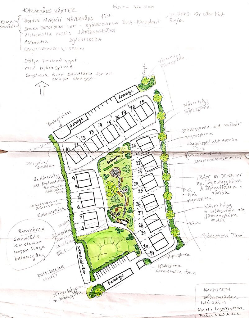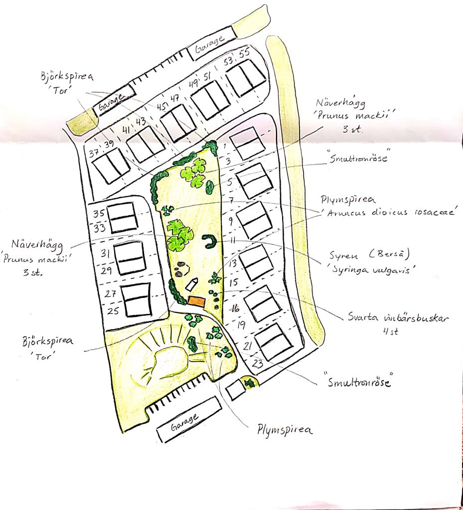 Samfälligheten lejde en landskapsarkitekt för att få ordning på den tomma grönytan mellan husen. En del av det denne föreslog har vi genomfört. En del har vi valt att avstå från. Första bilden visar arkitektens skiss. Andra bilden är vad som finns/är gjort fram till 2019.